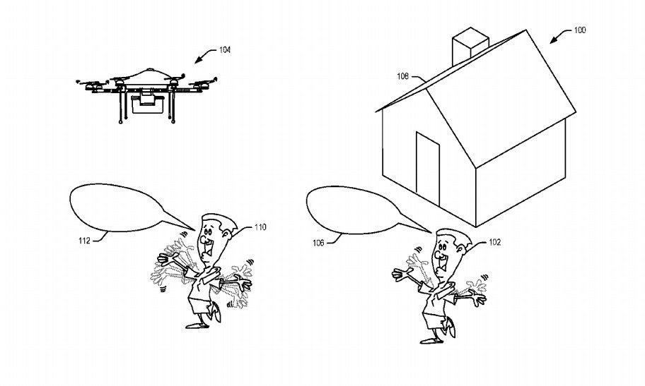 The document included several illustrations of the design, one of which shows the delivery drone and a man outside his home. He was wildly flailing his arms in what Amazon called an “unwelcoming manner,” a gesture as if to shoo away the drone overhead. A blank voice bubble suggests possible voice commands for the drone.